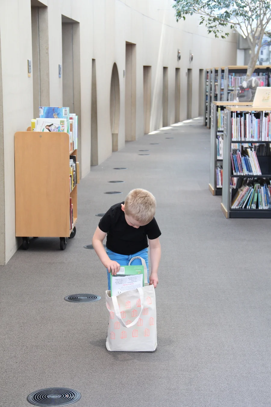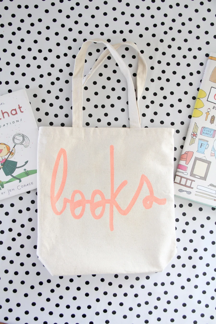 /Did you know it's national children's book week? We love books around here. A lot. Our visits to the library usually result in stacks of books that we end up struggling to carry. Enter the book tote! This will be so handy for our trips to the library over the summer. It's a simple freezer paper stencil. I used my Cricut Explore to cut the freezer paper, then just ironed it onto the tote and painted. It was so nice not having to cut out each piece by hand with an x-acto knife! But you could definitely do it that way if you don't have a Cricut handy. You can download the books pattern here and the word books right here. I left them in png form so you can size them however you need to for your own tote. I sized mine to be about 12 inches wide which fit our tote perfectly. I used neon coral fabric paint after the freezer paper stencil was on. I'm obsessed with this color! Elliott loved using his own book tote at the library. And I loved that I wasn't lugging around a ton of books for him. He was in charge of the books so if it got to be too heavy for him to carry, he had to put enough books back so he could carry it on his own. I don't know if that's a mom win or a mom fail, but it worked for me!