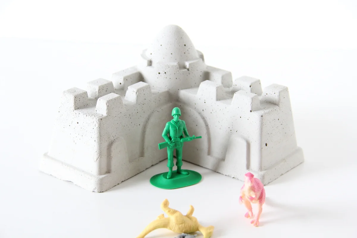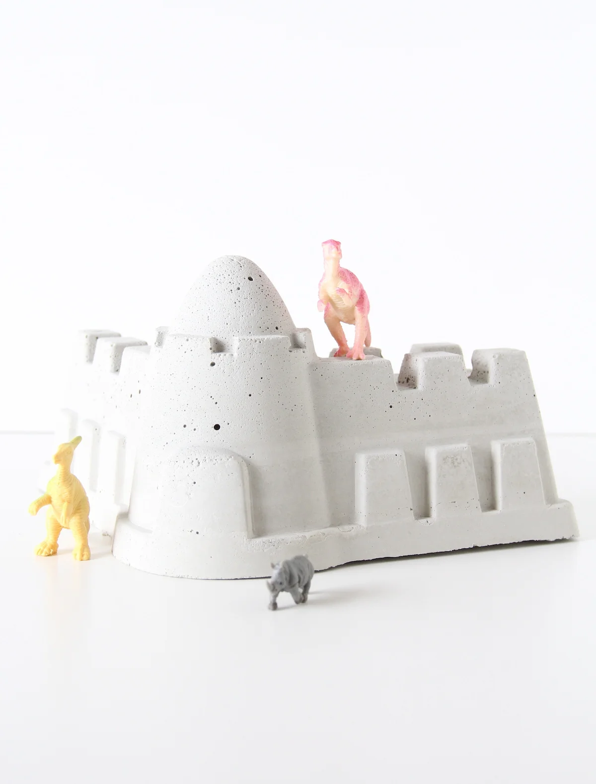 To make your own, all you need is some cement, a disposable container, a disposable spoon, the molds and some cooking spray. Just spray the inside of the molds, mix the cement according to the directions on the box and let it sit till dry. Once it's dry, gently pull the sides away from the cement and turn right side up. It should slide out really easily. Your new cement castle might be a bit hot, that is totally normal. Just let it sit and cool for a while, then play!