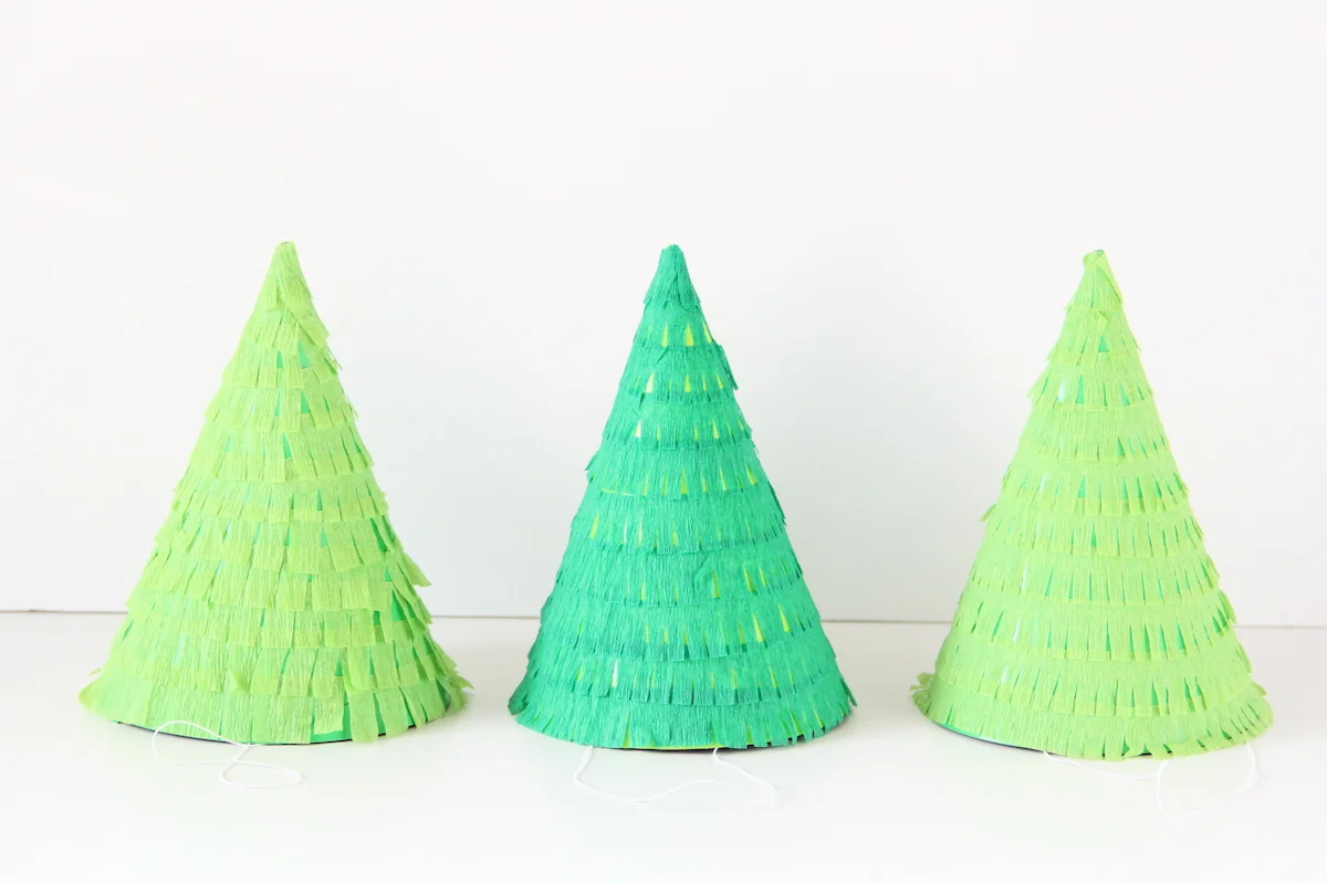 With some double sided tape to attach the fringe to some party hats. I used two different greens to make things a little more interesting, but you go ahead and do whatever floats your Christmas tree party hat boat.