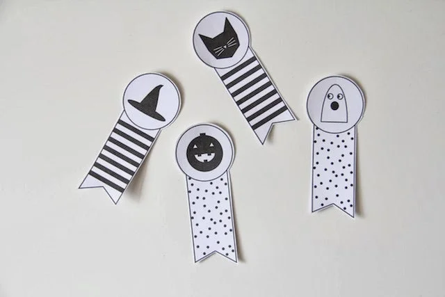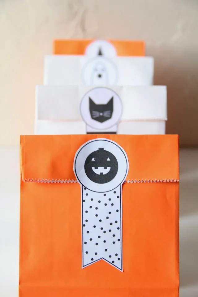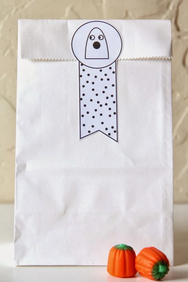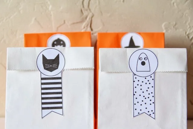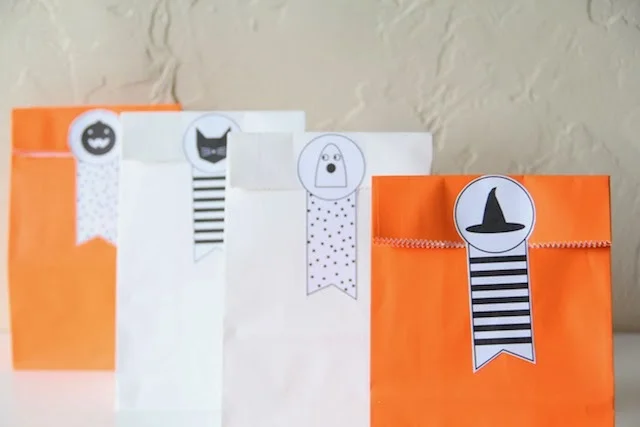 /These bags are perfect for any Halloween gathering you might have this year. Fill them with candy or caramel corn for an easy party favor for your guests. Or stick them on to a boring sack lunch to make it a little more festive! You can download the stickers here, print them off onto sticker paper, and stick them on! Easy, right? You may recognize three of these little guys, but there's a new addition! I had to make a witch hat. It just needed to be done. I hope you enjoy them as much as we do!