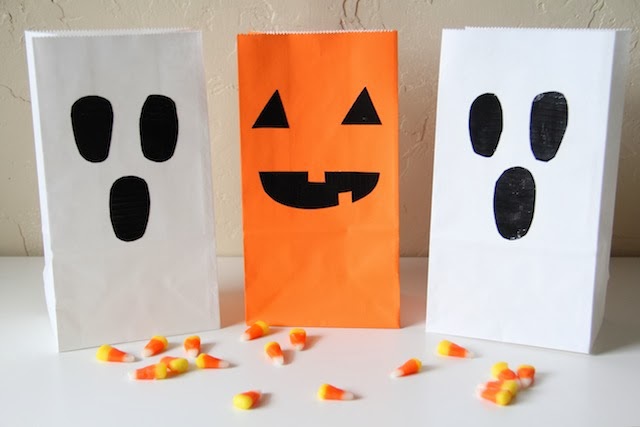 /Ok, so they're not so spooky, but I do love them. I made these a few weeks ago and Elliott has been begging me to make more. They are so easy to make, there's really no reason not to make them! They are great as party favor bags for little ones, or just to deliver Halloween treats to friends. If you have some black bags you could make some fun little vampire bats or black cats with some white tape. So fun! To see how to make your own, you can check out the full tutorial over here on Handmade Charlotte.