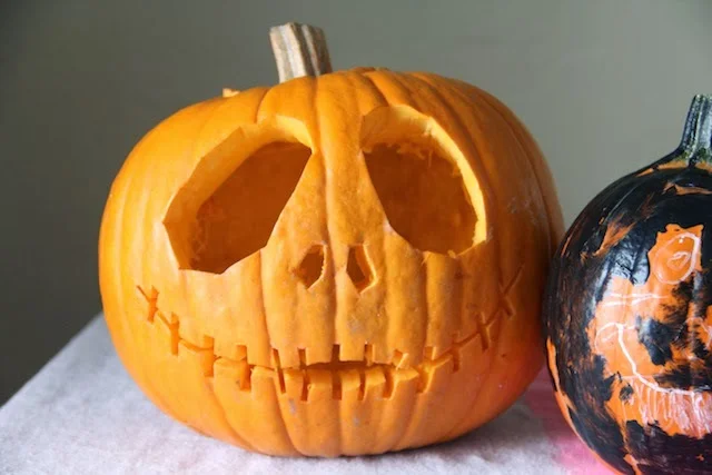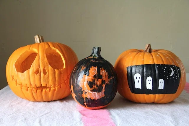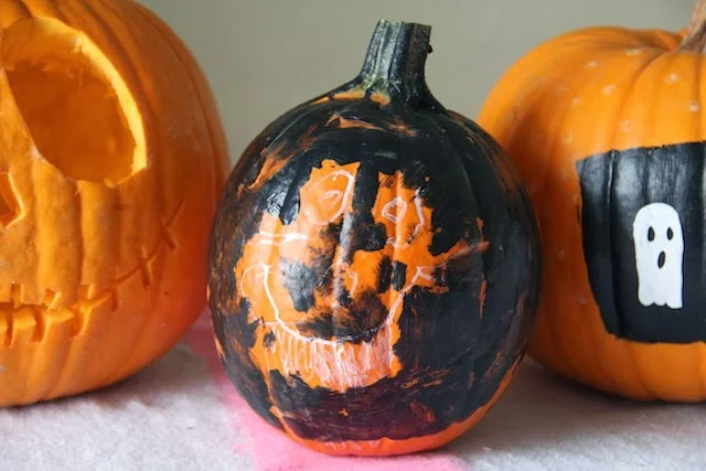 /Over the weekend we bought some pumpkins and decided to doll them up a bit. Elliott and I opted for paint but Preston tried his hand at the knife. Can you believe his mad skills? Without looking at anything, no stencils, nothing. Just did it. Elliott's is obviously a ghost super hero and mine is a ghostly family portrait complete with glow in the dark polka dots. We had a really fun time making them, but we're worried Jack might not make it to Halloween. Fingers crossed!