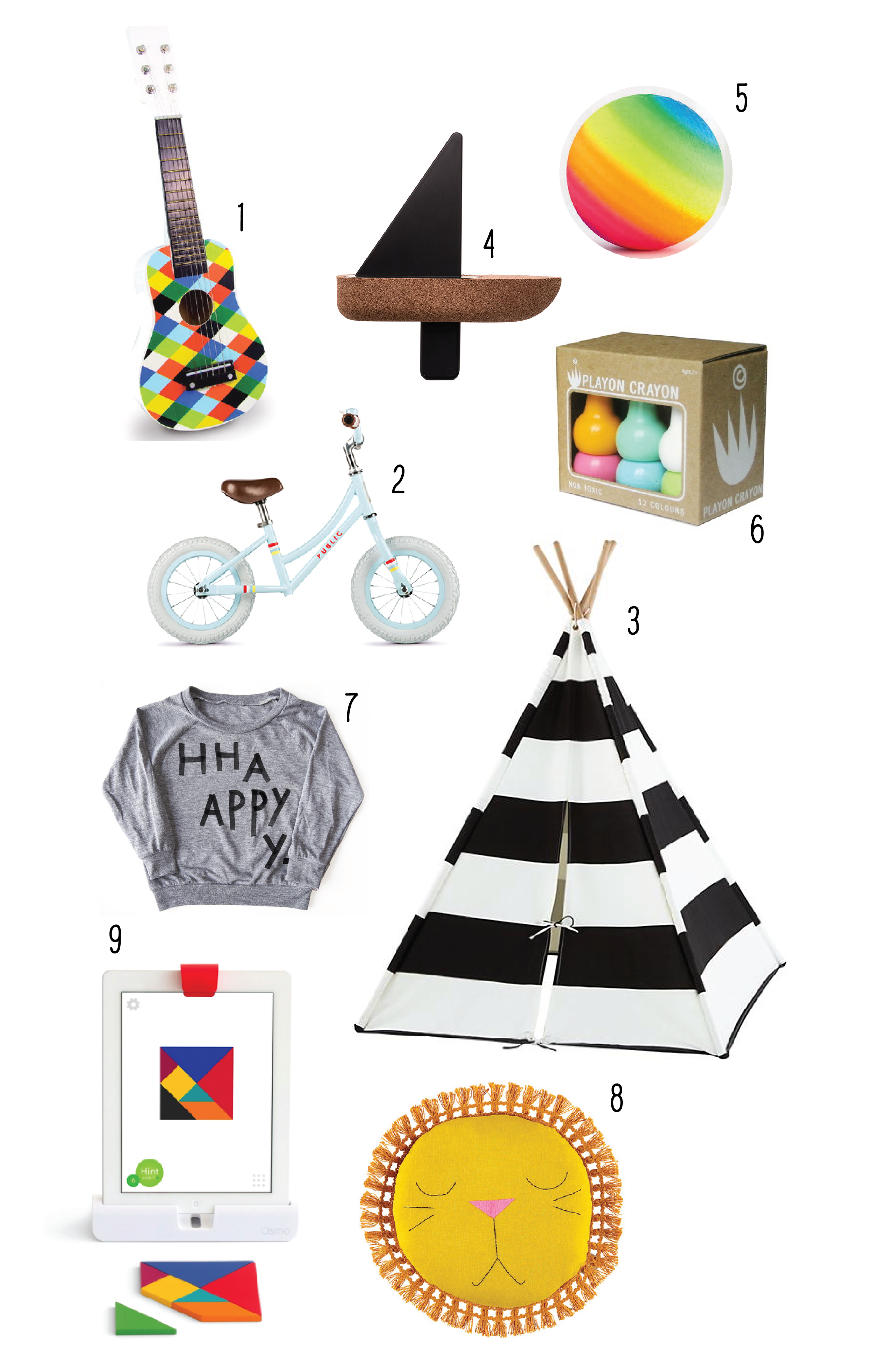 1. Colorful guitar. 2. Bike. 3. Teepee. 4. Cork sailboat. 5. Rainbow playground ball. 6. Playon crayons. 7. Happy sweatshirt. 8. Lion pillow. 9. Osmo - the most amazing thing to happen to the iPad. Ever.
