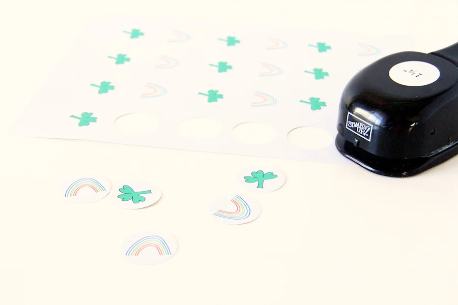 /It wouldn't be St. Patrick's day without some gold coins, right? I made some simple festive stickers to seal some treat bags for Elliott and his cousins. If you would like to make your own you can download the stickers, print them off onto sticker sheets and hole punch them to seal any bags of gold and goodies you might have for your little ones. Or! You can just make the stickers to let your kids wear on St. Patty's day. You can download the stickers right here. My hole punch is 1.25 inch so the shamrocks and rainbows are sized to fit that size. I left a little space so you could use a slightly larger hole punch too! No matter what size you make them or what you use them for, I hope you have fun with them!
