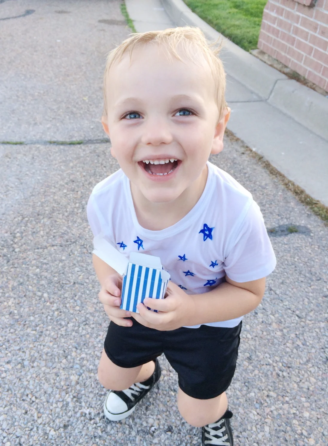 Elliott had a blast with his pop-its! They were less fun to clean up up, but you know. It was really hot, so the boy played quite a bit in the hose, hence the wet shirt.